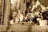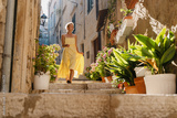 Smiling woman in dress walking in street of Korčula town in Croatia.