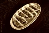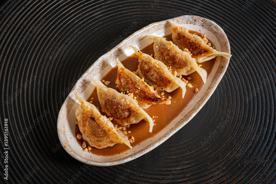 Golden-brown dumplings filled with savory goodness, served with dipping sauce on a platter