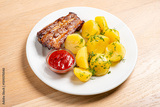 A wooden table features grilled meat, tender boiled potatoes, and vibrant sauce on a plate