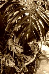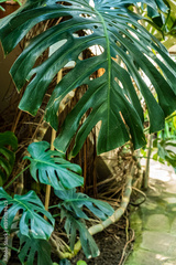 Vibrant monstera leaves embrace light and shadow, bringing a lush energy to the tranquil greenhouse