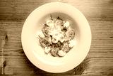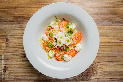 Colorful assortment of fresh vegetables and creamy cheese arranged beautifully in a bowl on wood