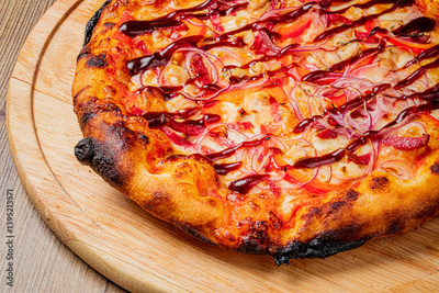 This delicious pizza features vibrant toppings and a rich barbecue sauce, inviting all to enjoy