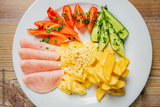 A colorful breakfast features scrambled eggs, veggies, and golden fries for morning delight