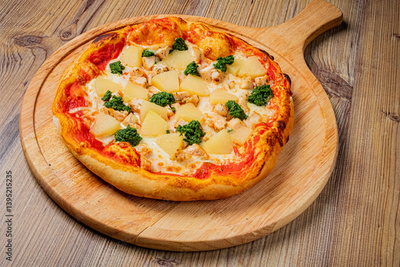 Mouthwatering pizza topped with pineapple and fresh greens inviting you to take a bite