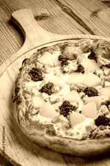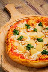 Delicious pizza with chicken, pineapple, and herbs on a wooden surface