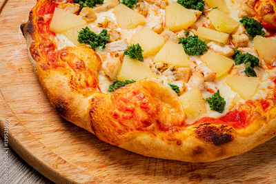 Delicious pizza topped with savory chicken, sweet pineapple, and fresh greens, ready to enjoy!