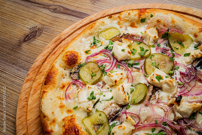 Enjoy the gourmet pizza with pickles and creamy cheese, baked to perfection!