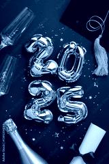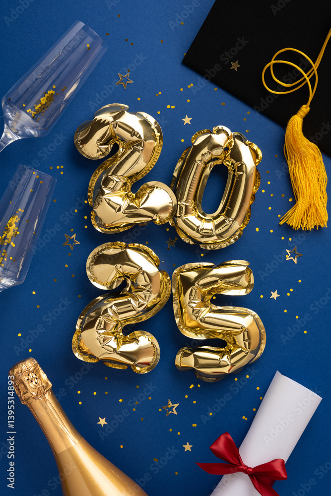 Graduation concept featuring golden balloons spelling 2025, champagne, diploma, and cap on vertical blue background
