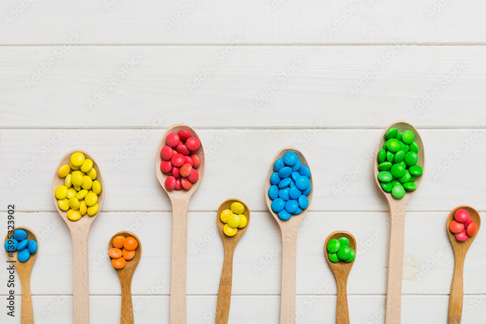 delicious colorful sweet candies on spoon on colored background . Confectionery decor top view with copy space