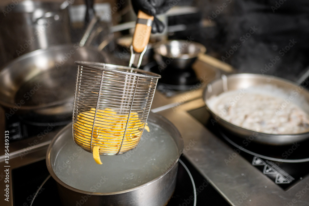 A chef in a professional kitchen uses a wire strainer to lift yellow pasta from boiling water, showcasing precise cooking techniques and equipment.