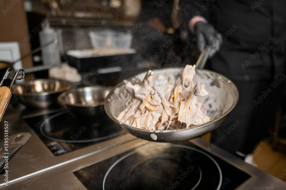 A chef in black gloves skillfully flips creamy pasta in a stainless steel pan, showcasing culinary expertise and technique in a professional kitchen setting.