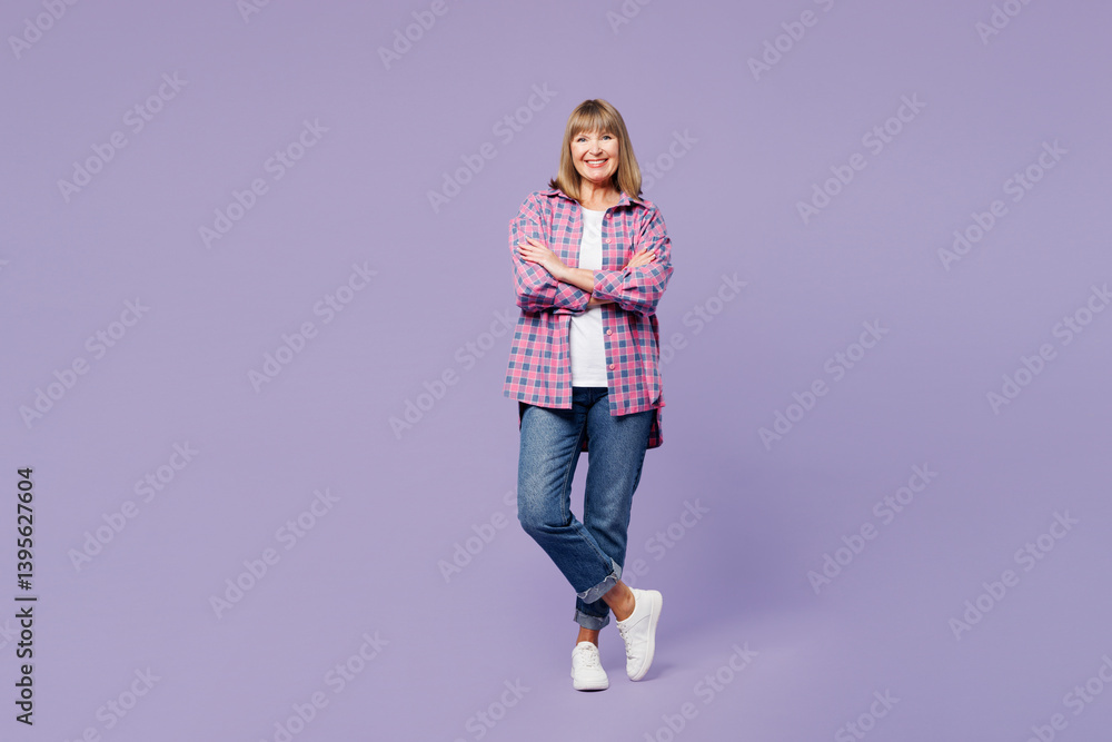 Full body elderly blonde woman 50s years old wear violet shirt casual clothes hold hands crossed folded look camera isolated on plain pastel light purple background studio portrait. Lifestyle concept.