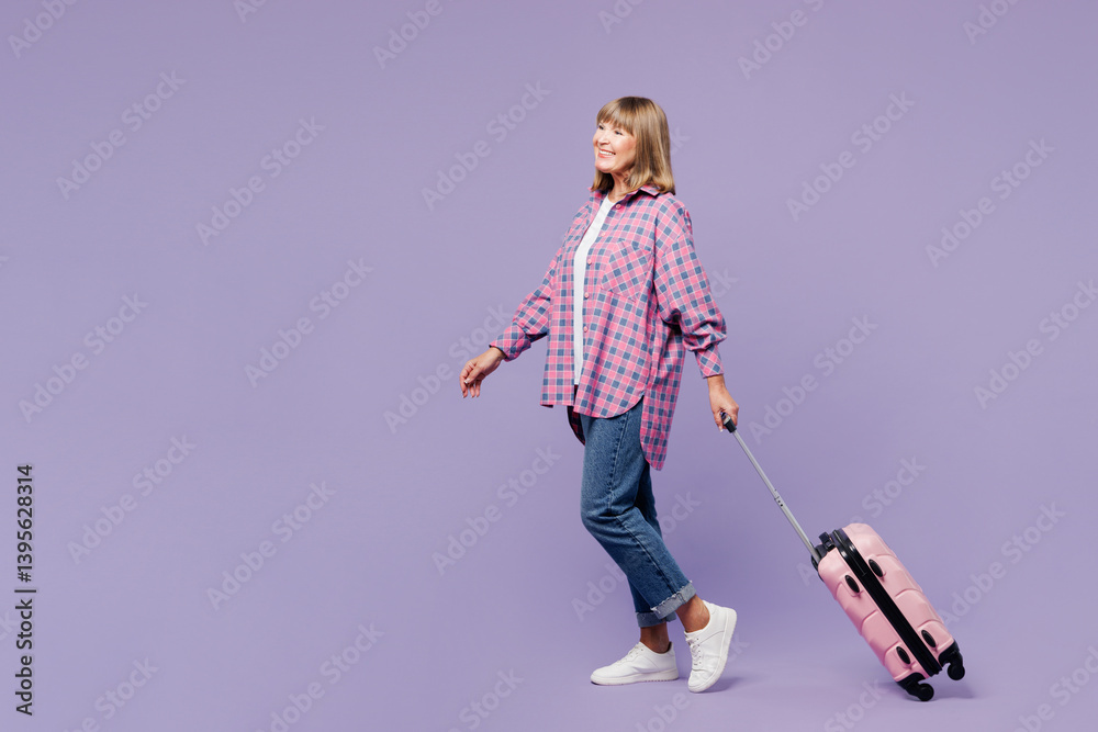 Traveler elderly woman wears violet casual clothes hold suitcase bag isolated on plain purple background studio. Tourist travel abroad in free spare time rest getaway. Air flight trip journey concept.