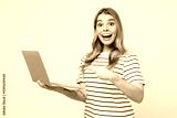 Young shocked surprised happy IT woman wear striped t-shirt casual clothes hold use work point finger on laptop pc computer isolated on plain solid white background studio portrait. Lifestyle concept.