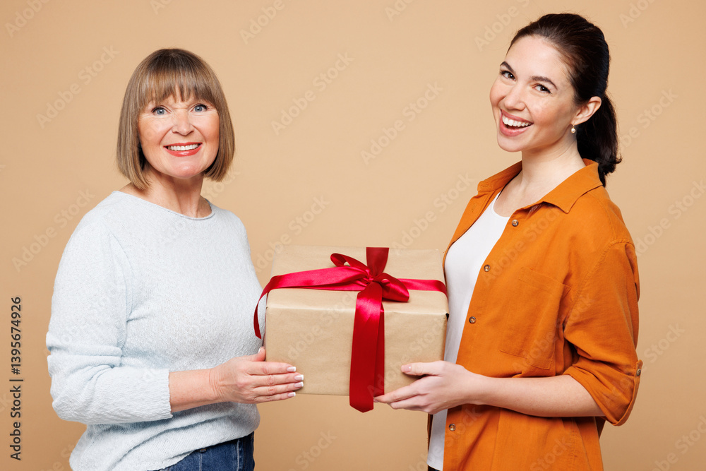 Sideways elder parent mom 50s years old with young daughter two women together wear casual clothes holding give present box with gift ribbon bow isolated on plain beige background. Family day concept.