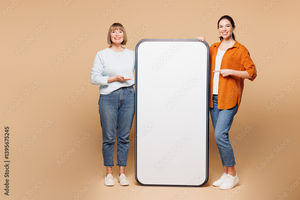 Full body elder parent mom with young adult daughter two women together wearing casual clothes point on big huge blank screen mobile cell phone isolated on plain beige background. Family day concept.