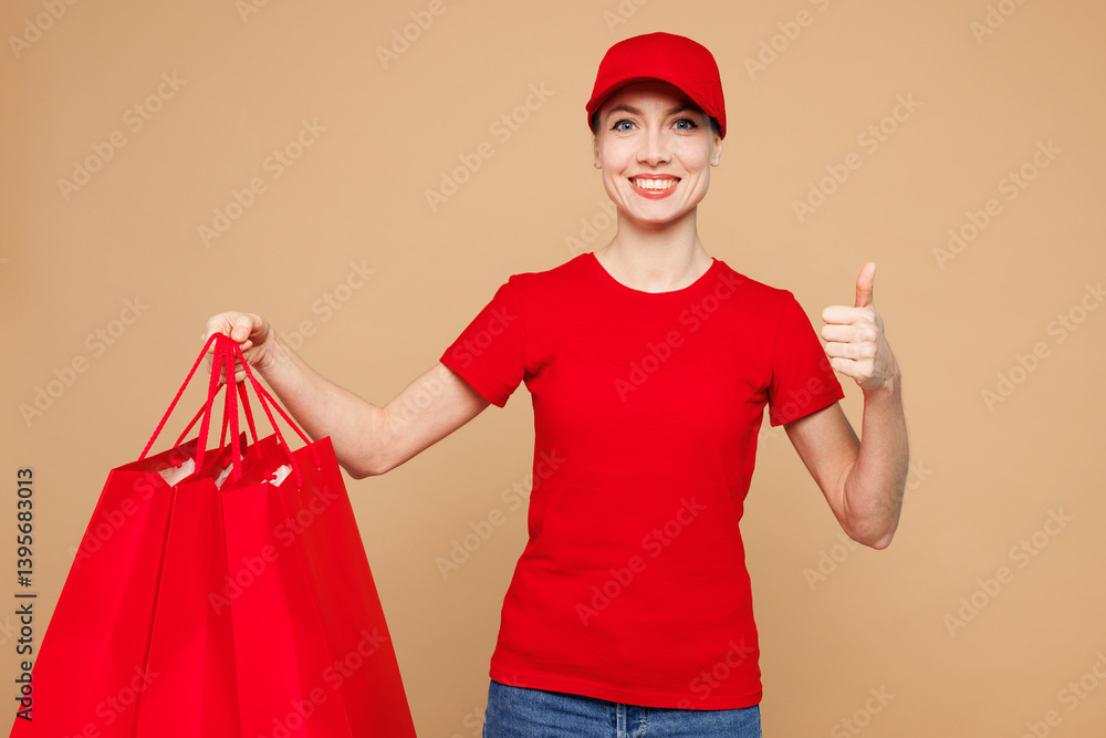 Delivery girl employee woman in red cap t-shirt uniform workwear work as dealer courier hold shopping paper package bags show thumb up isolated on plain beige background Service Black Friday concept
