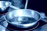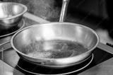 A close-up of a stainless steel frying pan on a stovetop with steam rising, indicating it is hot and ready for cooking. The pan’s surface shows signs of previous use with some residue.