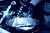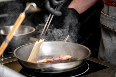 A chef wearing black gloves cooks bacon in a pan on a stovetop, with steam rising, showcasing the art of frying in a professional kitchen environment.