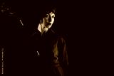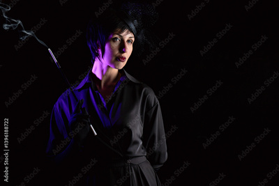 Retro noir style. Dramatic portrait of a beautiful charming brunette smoking woman in black dress with mouthpiece against black background