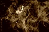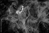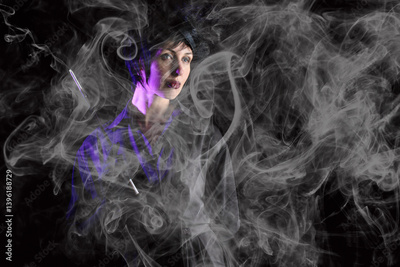 Retro noir style. Dramatic portrait of a beautiful charming brunette smoking woman in black dress with mouthpiece against black background in smoke.