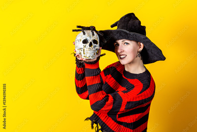 Halloween Theme. Young witch in black hat, striped sweater holding skull and spider against yellow background.