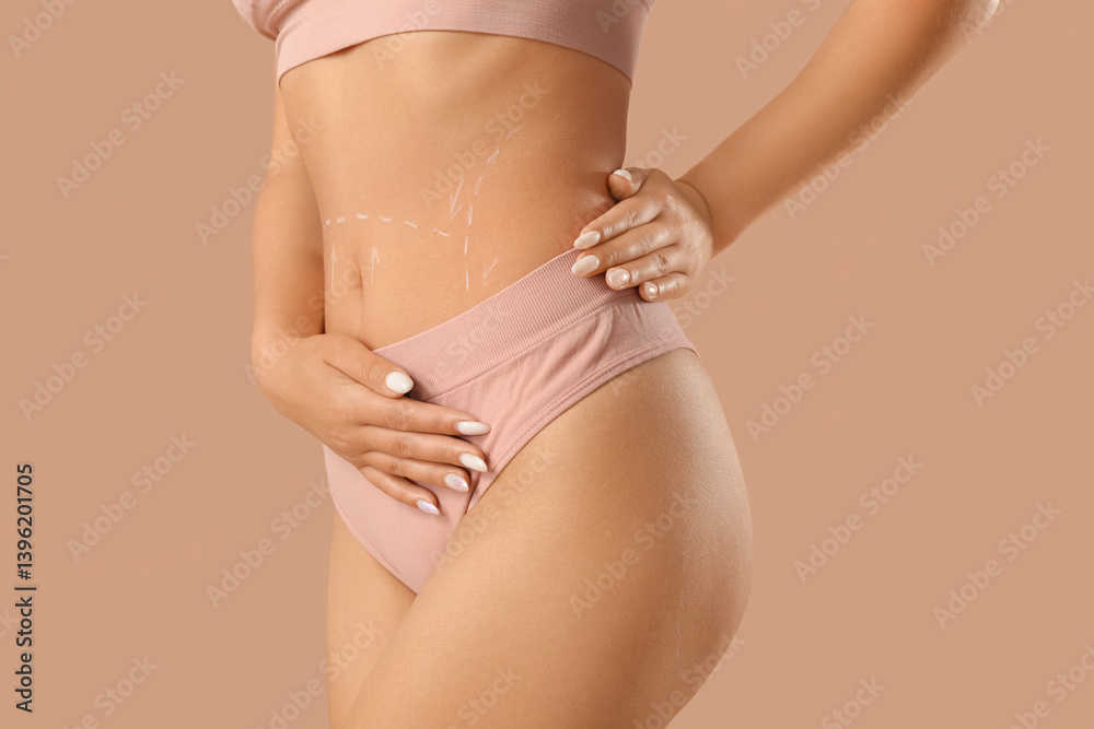 Woman in underwear with marks on her belly against beige background, closeup. Plastic surgery concept