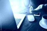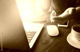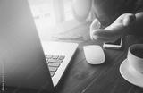 businessman hand working laptop on wooden desk in office in morning light. vintage effect