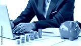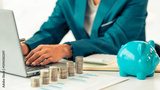 Businessman's hands working with calculator and piggy bank with pile of coins on table. Financial accounting concept.