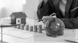 Piggy bank, coins and money bag with house model represent financial goals, to save money, plan to save money, savings, investment, financial freedom, business, hope for success.