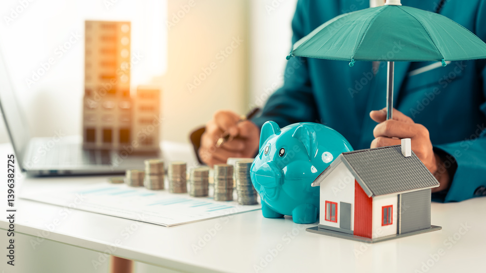 Businessman holding green umbrella on house home insurance, housing, real estate, mortgage, protection, safety, investment, business