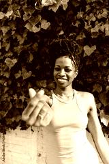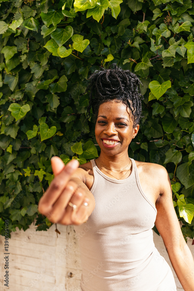 Beautiful dancer making korean finger heart in front of green leaves wall