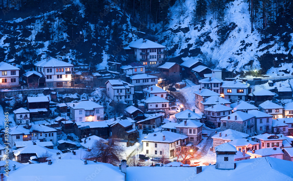 Snowy fairytale in Bulgaria. Night goes down over Shiroka Laka village, Bulgaria