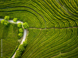 Aerial view of Cha Gorreana tea plantation on Azores. Texture of repeating rows of tea bushes as seen from above. No people in the scene.