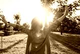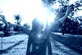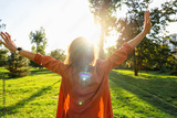 Rear view of woman with raised arms in nature basking in backlit sunshine