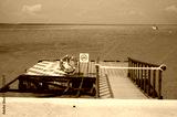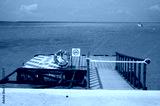 Wooden pier with lifebuoy and no smoking sign over crystal clear turquoise sea. Tranquil view from tropical island resort in the Maldives