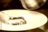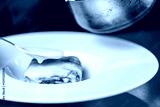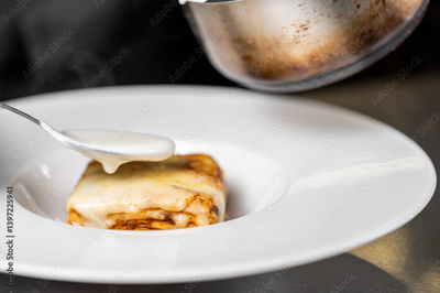 A piece of lasagna on a white plate, with creamy sauce being poured over it by a spoon, showcasing a delicious gourmet meal prepared with elegance and culinary skill.