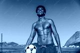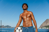 Shirtless young man with toned physique at the beach holding a soccer ball