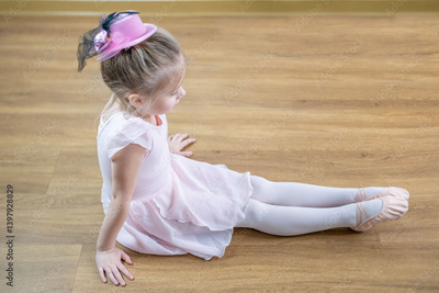 Cute 5-year-old ballerina girl holding tired legs. Ballet practice. Dance and art, dance injury, pointe shoes, discipline of ballet