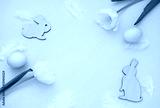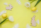 Easter yellow frame with bunny, eggs, tulips. Top view