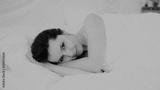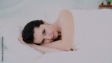 Morning of beautiful girl in light apartments. Young woman lying in bed, waking up and smile. Female looking at camera.