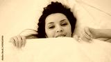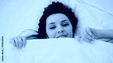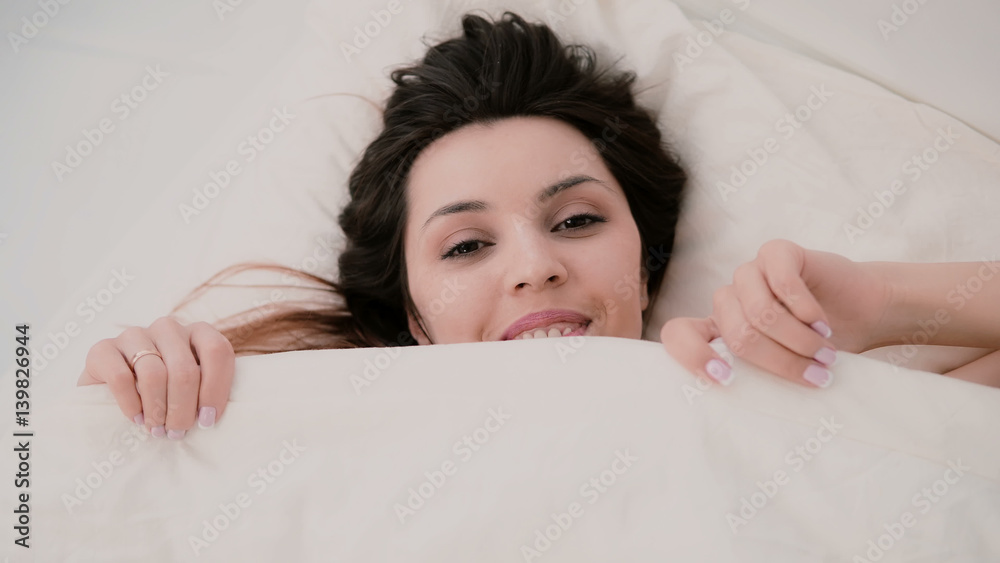 Young woman wakes up and have fun in bed. Girl start to hiding under sheets, making funny face and blowing hair
