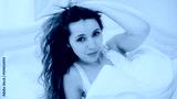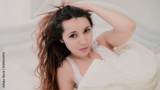 Young woman wakes up and have fun in bed. Girl start to hiding under sheets, making funny face and blowing hair