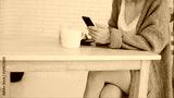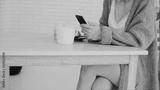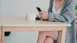 Beautiful woman sitting in a cozy apartment and surfing the Internet. Brunette girl uses smartphone and drinks coffee.
