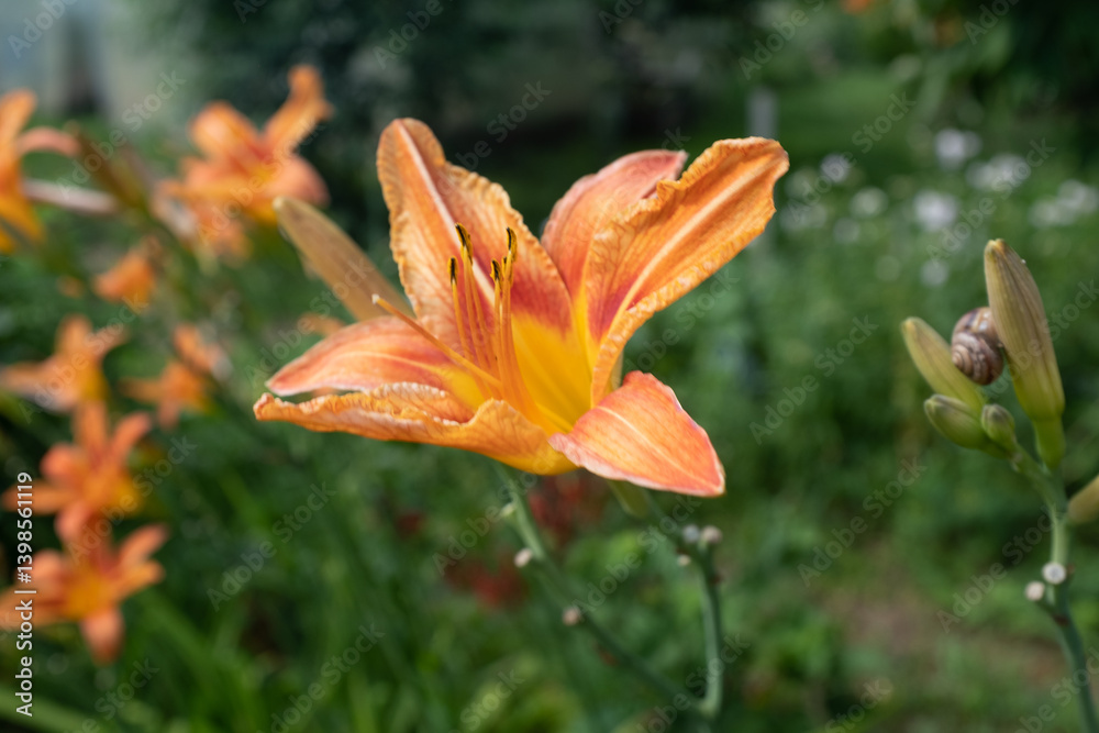 Orange Daylily (Hemerocallis fulva) in Full Bloom – Bright Summer Perennial Flower with Trumpet-Shaped Petals for Gardens, Naturalized Landscapes, and Pollinator Habitats. High quality photography
