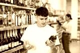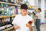 Portrait of thoughtful young guy reading labels on bottles of alcoholic drinks while shopping in supermarket