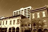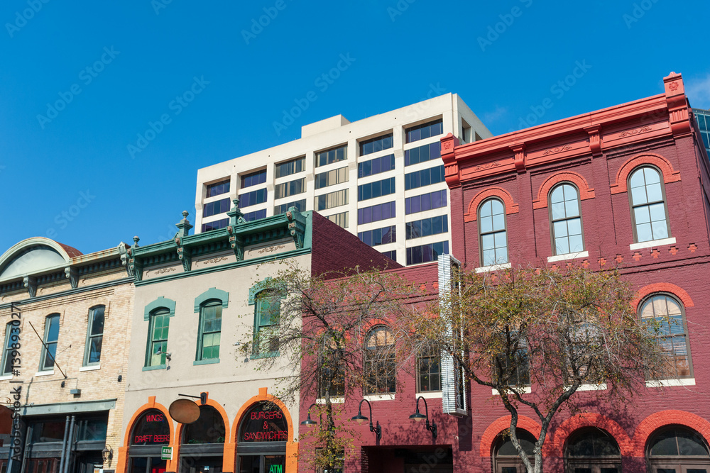 Historic 19th century brick buildings on famous 6th street in downtown Austin, Texas, USA
