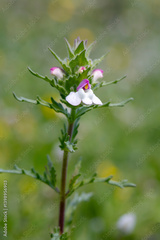 Mediterranean lineseed, Bellardia trixago, Trixago bartsia, erect herb with sawtoothed leaves dotted with glands and hairs, terminal spike of white lipped flowers.