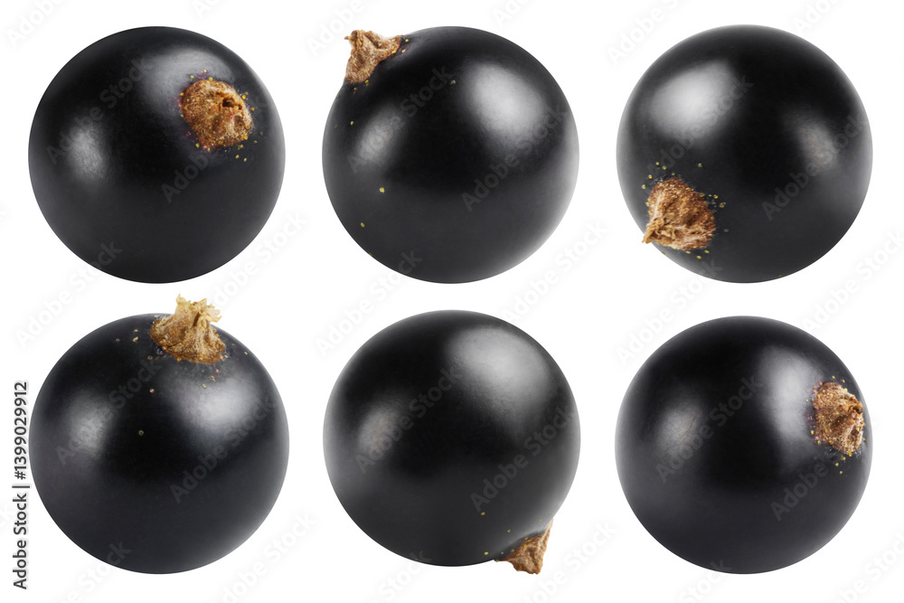 Blackcurrant isolated set. Collection of currant berries on a transparent background, in different angles.