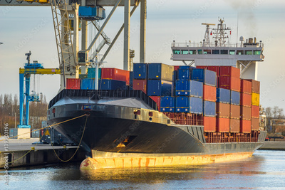 Szczecin ,Poland-January 2017:sea container flows into port for unloading harbor cranes and gantries